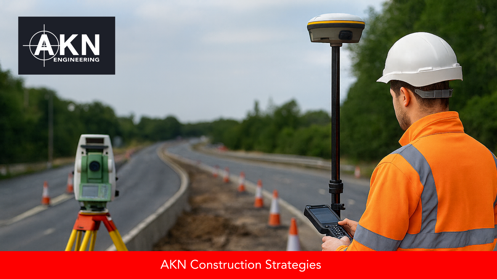 At AKN Engineering, we prioritise setting out control points before anything else. For highways jobs, we establish a network using GNSS base-rover systems and cross-check with total station traverses.